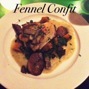 My wife’s entree (which I had a lot of), the Fennel Confit was made up of squash, portobello bacon and kale in apple-onion sage sauce.