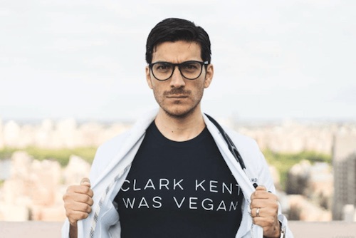 VEGAN DOCTOR MAURICIO GONZÁLES-ARIAS, M.D. WEARS “CLARK KENT WAS VEGAN” T-SHIRT IN ECO TRI-BLEND VINTAGE FROM CRAZIES AND WEIRDOS.